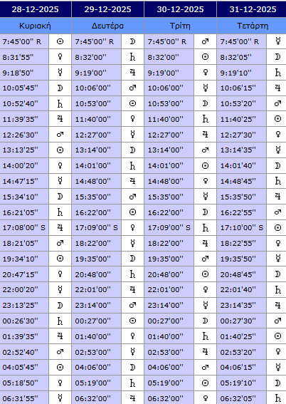 ΠΛΑΝΗΤΙΚΕΣ ΩΡΕΣ 28.12-31.12.2025